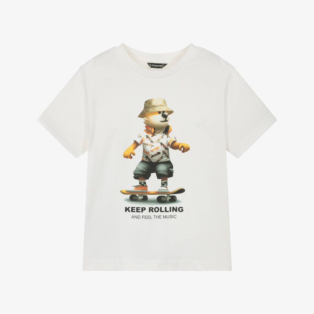 An every day wardrobe staple, this boys ivory cotton T-shirt is by Mayoral. Casual and comfortable, it is made in soft jersey with a cool skateboarding bear printed on the front.