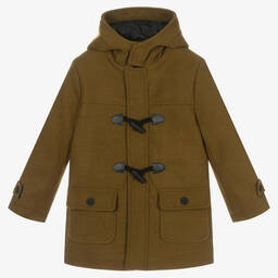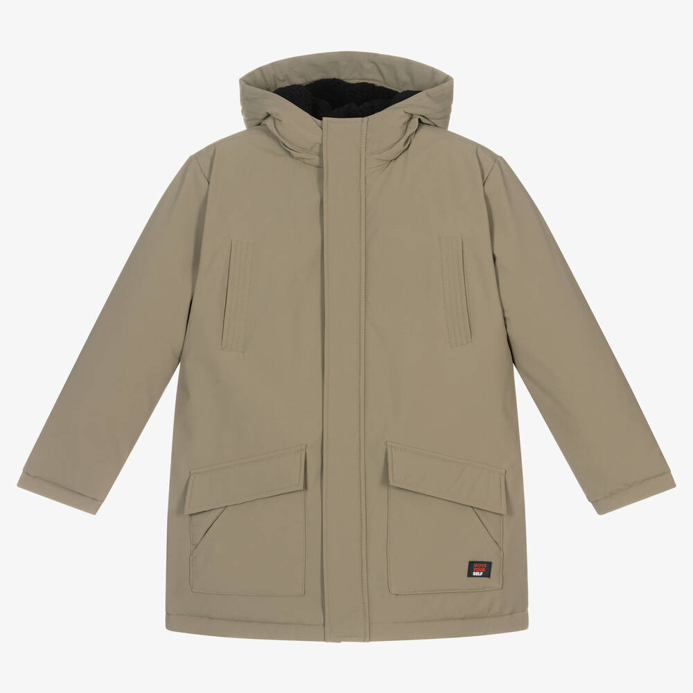 Pale khaki green coat for boys by Mayoral Nukutavake, made in smooth, woven fabric. Padded for extra warmth, it fastens with a concealed zip and poppers for protection against the weather. There are two pouch pockets on the front, which have integrated side pockets ideal for keeping hands warm and two chest pockets. The hood and top section are lined with soft fleece and there is an internal adjustable toggle drawstring waist.