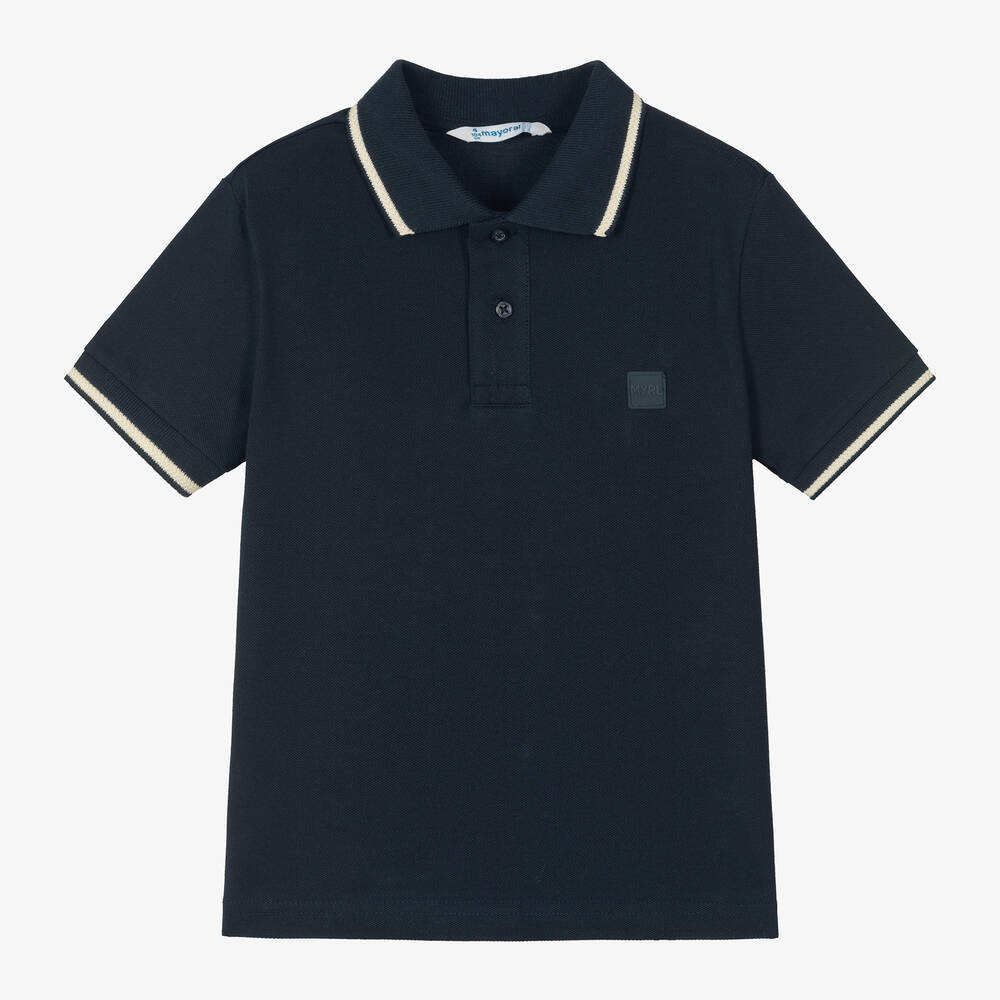 Navy blue short-sleeved polo shirt for boys by Mayoral, made in soft cotton piqué. Classically styled with a ribbed collar and cuffs and front button fastenings, it has a rubberised logo patch on the chest. There are contrast ivory woven trims for a sporty look and stylish side splits on the hem.
