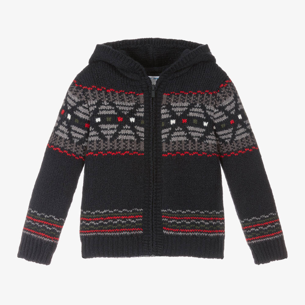 Navy blue hooded cardigan for boys by Mayoral, knitted in a soft cotton-rich blend. Patterned with a red and grey Fair Isle-inspired design, this layering item has comfortable, stretchy trims and fastens with a smooth zip on the front.