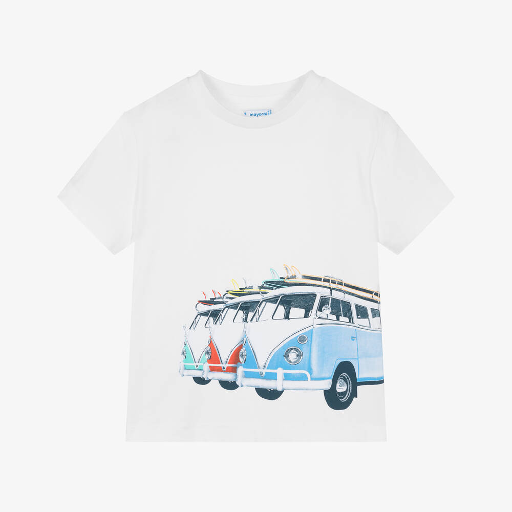 White T-shirt for boys by Mayoral, made in soft cotton jersey. This casual tee has short sleeves and a classic crew neck. It features a colourful camper van and surfboard print on the front.