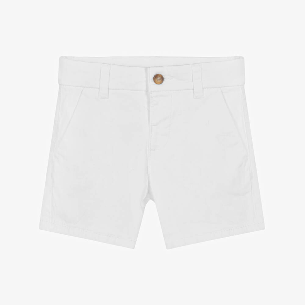 White chino shorts for younger boys by Mayoral, made in soft cotton twill with a hint of stretch. These classic shorts have pocket detail and logo embroidery on the back in a tonal shade. They have an adjustable waistband and a neat button fastening.