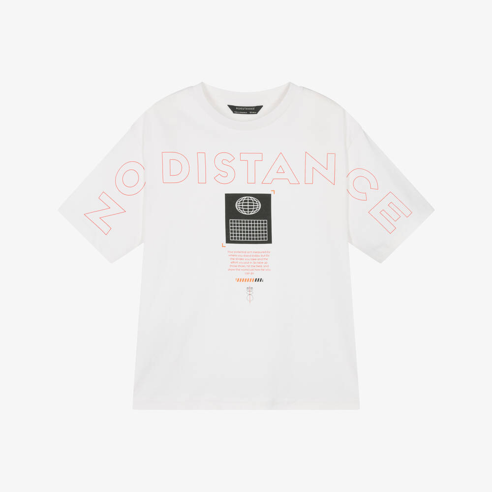 White cotton T-shirt for older boys by Mayoral Nukutavake, made in soft, wearable jersey. It has oversized red lettering across the sleeves and chest, spelling out 'No Distance'. A positive message is printed on the front for an uplifting touch.