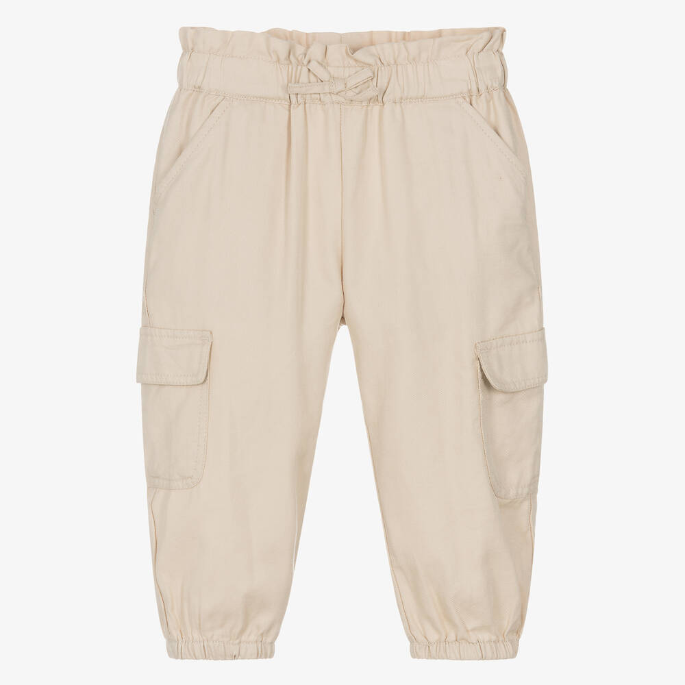 Beige cotton-blend trousers for little girls by Mayoral, with useful cargo pockets. Made in lightweight twill, they have a comfortable, elasticated waist and cuffs. Easy to wear, they simply pull up.