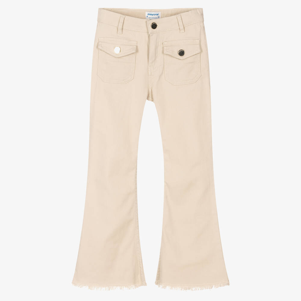 Girls stylish beige jeans from Mayoral, made in soft cotton denim with a slight stretch for comfort. Button-fastening patch pockets on the front give a modern twist and they have cool frayed hems. To complete the look they have branded gold metal hardware and a gold logo patch on the back, and the waistband is adjustable for a great fit. Made with sustainable cotton.