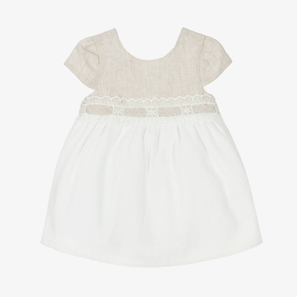 Lovely for a special occasion, this beige and ivory dress for baby girls is by Mayoral. Woven in a soft linen blend, the bodice has elegant capped sleeves and a pretty lace trim around the waist. The sheer skirt has a lightweight underskirt and a tulle-trimmed lining for extra volume. Fastening with a neat zip on the back, this beautiful dress comes with matching beige knickers.
