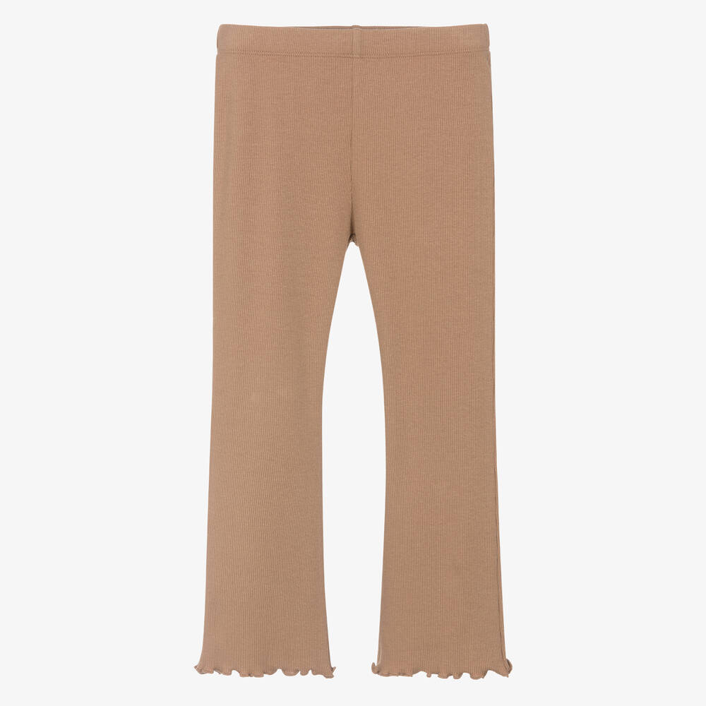 Dark beige leggings for girls by Mayoral, made in soft, ribbed cotton jersey. Comfortable and casual, they have a gently flared leg with pretty curly cuffs and an elasticated waistband for a comfortable fit.