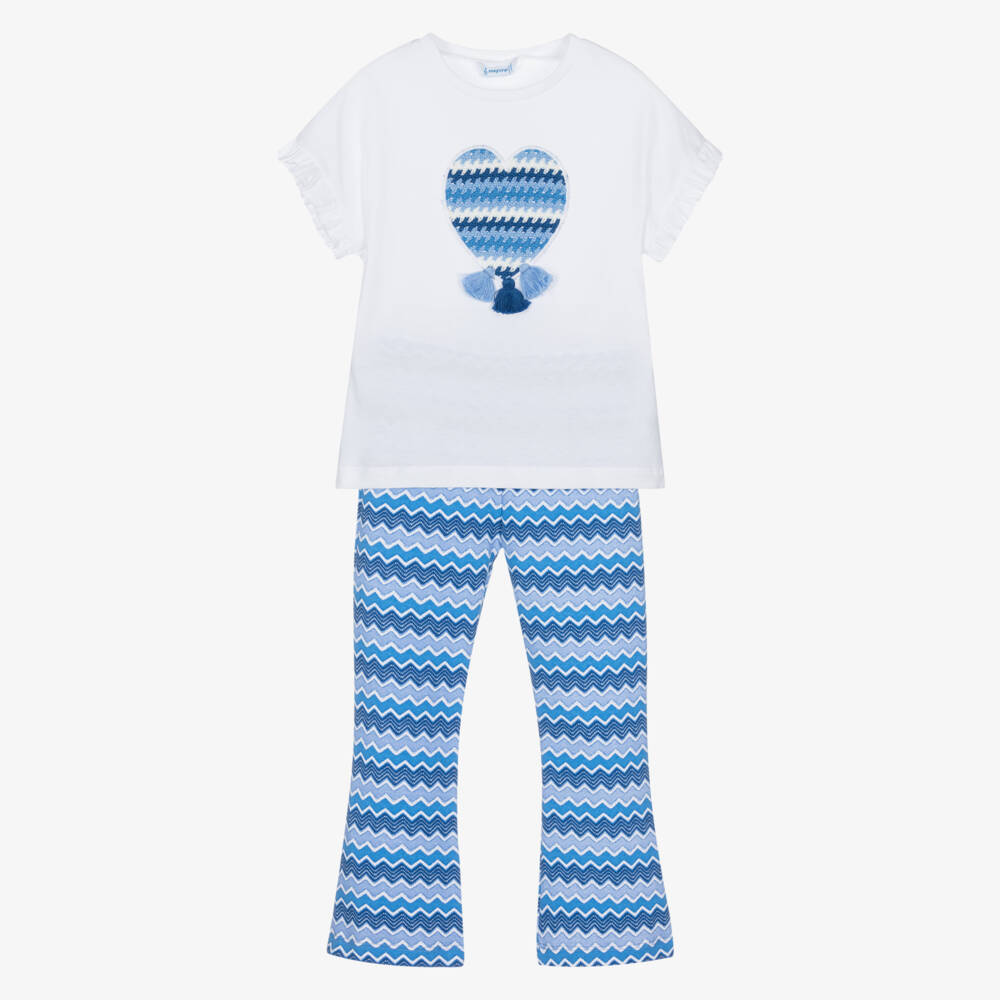 Lovely blue and white leggings set for girls by Mayoral, made in soft cotton jersey. The top has pretty frilled cuffs on the short sleeves and a blue and white crocheted heart motif on the front with tassel trims. The leggings have a fun blue zigzag pattern. They are gently flared and have a comfortable elasticated waistband.