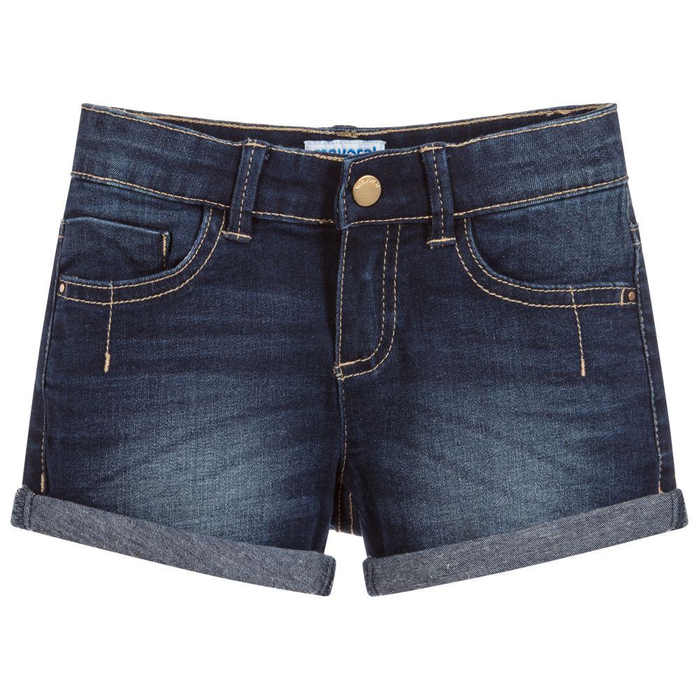 Dark blue denim shorts for girls by Mayoral, with a relaxed washed and faded look. Super comfortable to wear, they are made in soft and stretchy cotton denim, with popper and zip fastening, and an adjustable waist for a perfect fit.