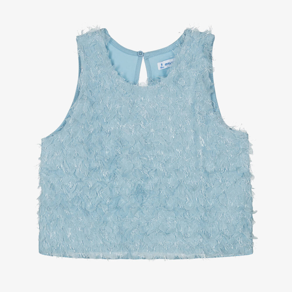An elegant sleeveless top for older girls by Mayoral. Made in pale blue cotton jersey, it has a mesh overlay on the front decorated with soft tulle petals and delicate fringing. The top has a keyhole button fastening on the back.