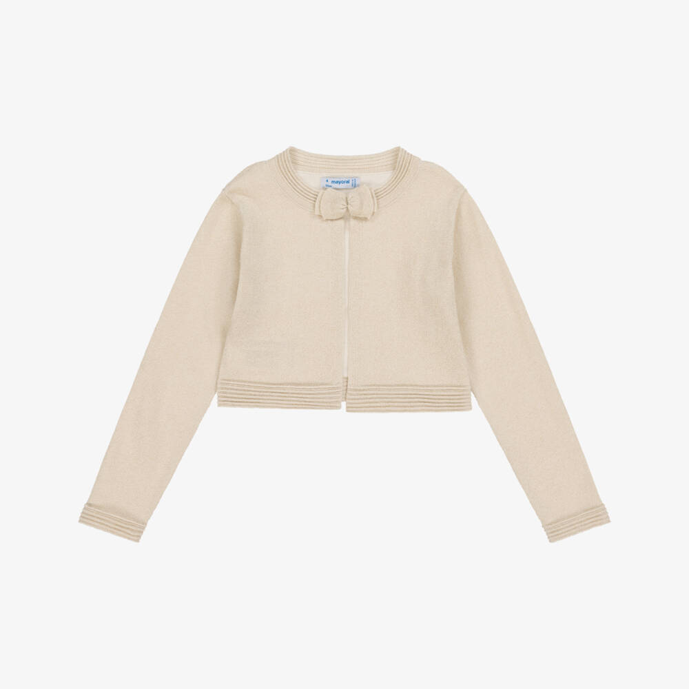 Girls glittery gold cardigan by Mayoral, ideal for a special occasion or for elevating an everyday look. Made in a lightweight, cotton blend, it has a pretty bow over the button fastening on the neckline and smart, horizontally ribbed trims.