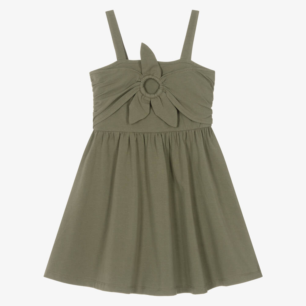 Lovely khaki green dress for older girls by Mayoral, made in soft and comfortable jersey. This sleeveless style has a gently fitted bodice with pretty petal shape detailing.