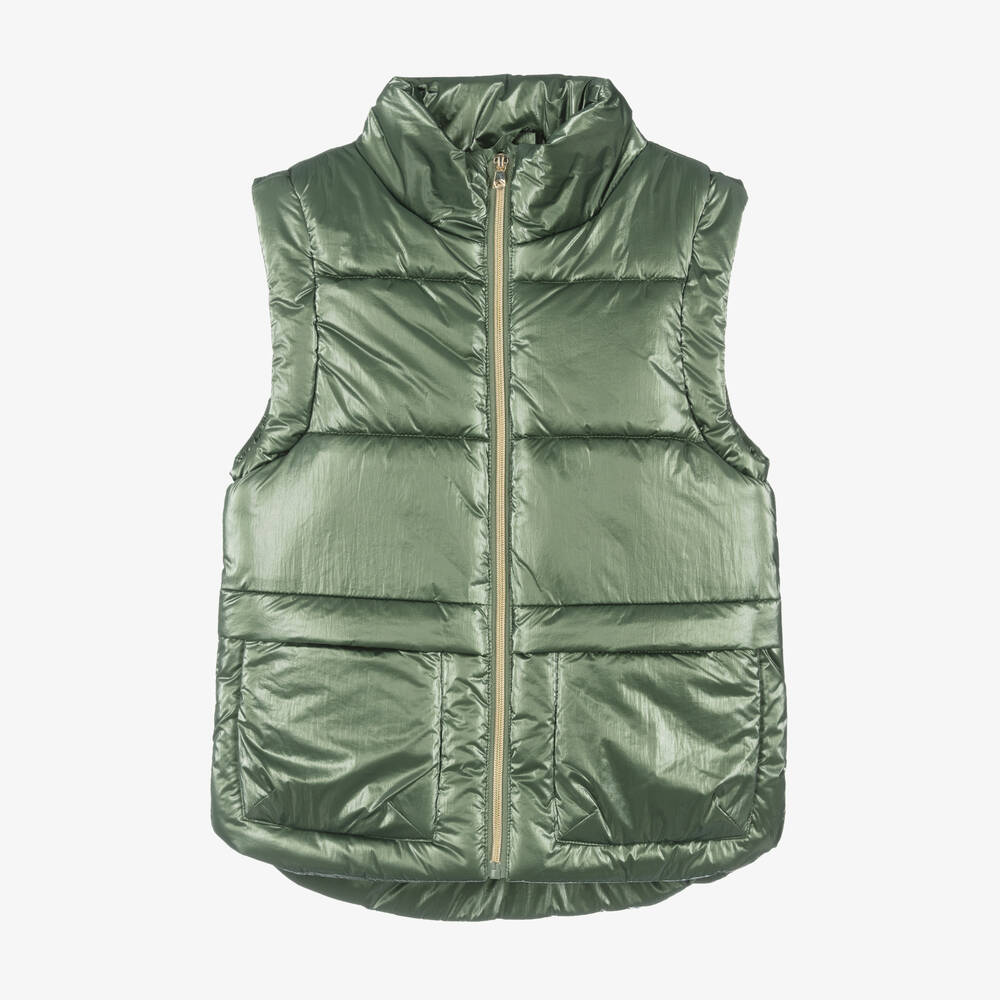 A green padded gilet for older girls by Mayoral, in a silky smooth, shimmery fabric. Lined in cosy fleece for extra warmth, this sleeveless jacket has large patch pockets partially hidden beneath the front flap detailing and a gold zip fastening. This gilet contains recycled fibers.
