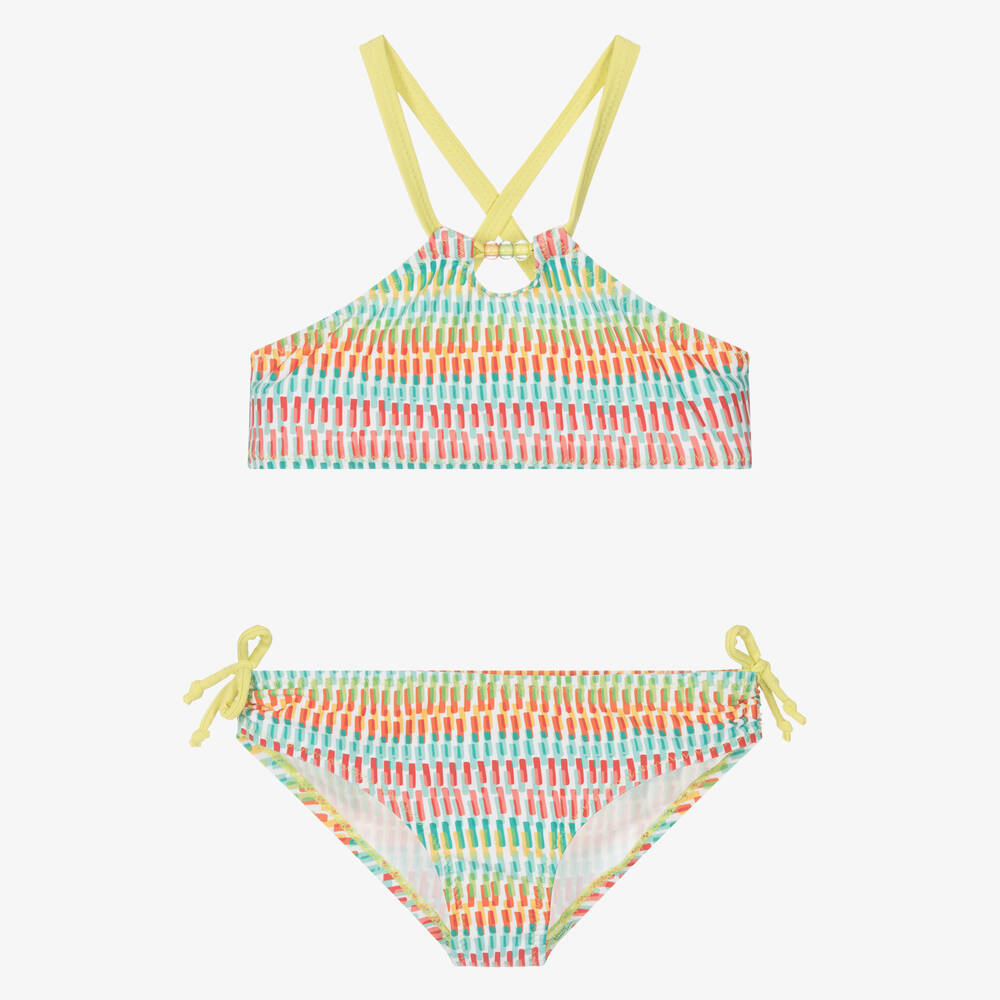 Girls green bikini by Mayoral, striped in lime green, blue and pink. Soft and silky, the top part has cross-over straps with pretty beads, whilst the lower part has cut-out detailing with fixed bows.