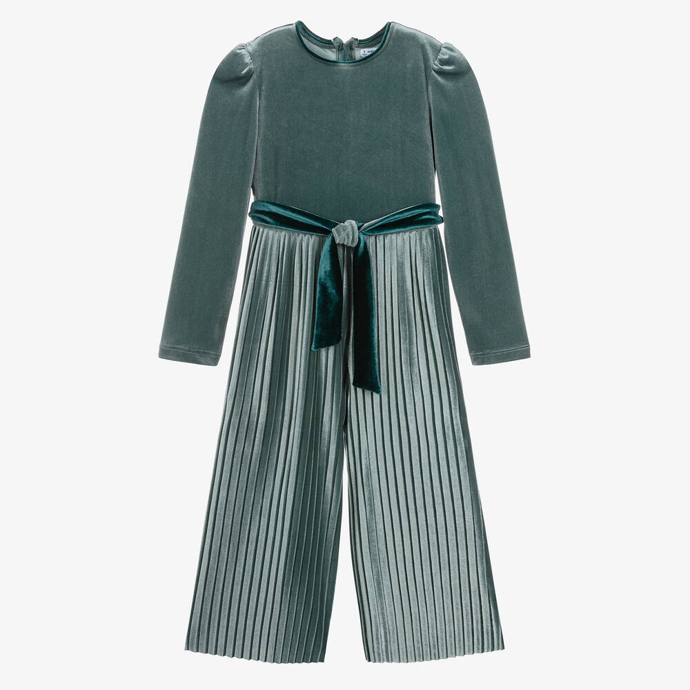 In a lovely shade of sage green, this stylish jumpsuit for girls is by Mayoral. Made in soft velour with a velvety sheen, it has elegant puffed shoulders and is pleated from the waist down. There is a concealed zip fastening on the back, with a fixed sash belt that ties at the front.