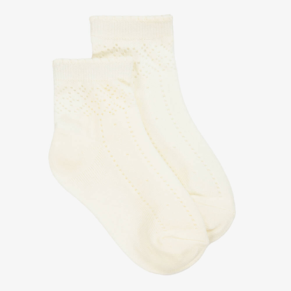 Lovely and soft ivory socks for girls by Mayoral, made in a breathable cotton rich blend. Offering comfort and style, these wardrobe essentials feature a delicate pointelle design and scalloped cuffs.
