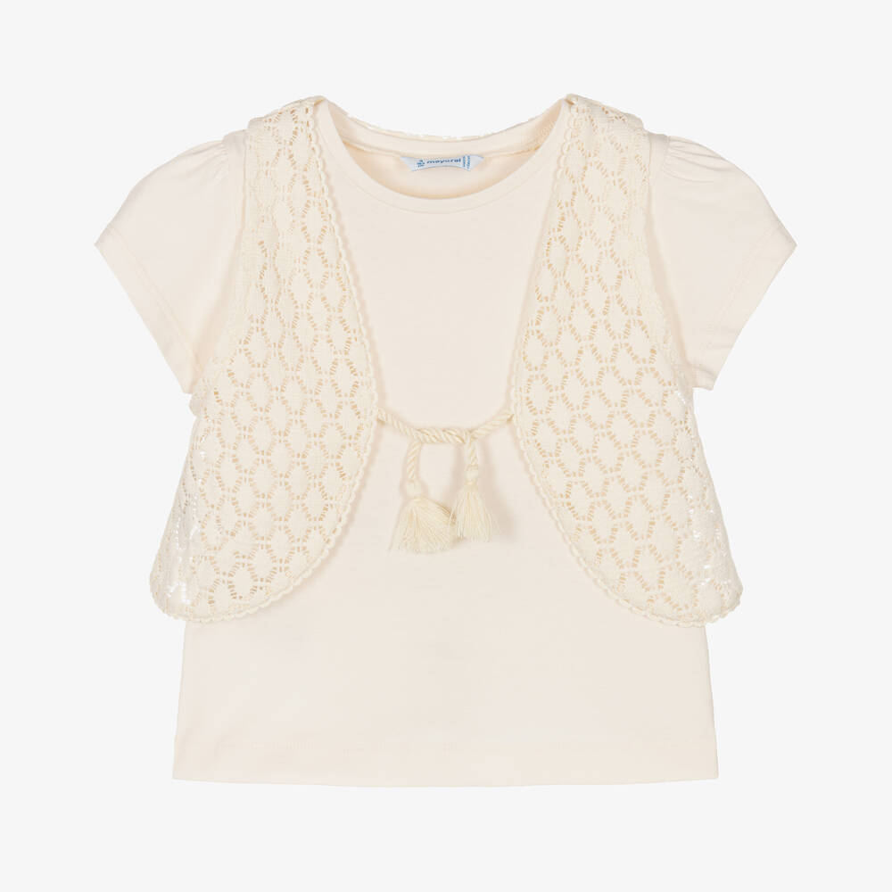 Casual ivory T-shirt for girls by Mayoral, made in soft cotton jersey. Cool and comfortable, this wardrobe staple has gently puffed short sleeves. For versatile styling, it comes with a pretty lacy knit waistcoat which has tie fastenings on the front with tassel trims.