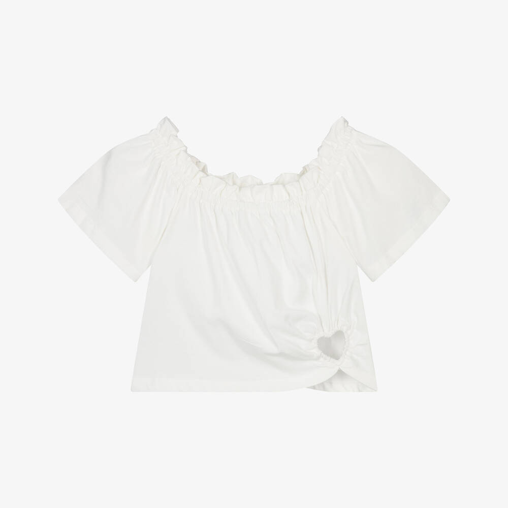 Lovely ivory cropped top for older girls by Mayoral, made in soft organic cotton jersey. It has a sweet heart-shaped ring detail on the side for a cute cut-out effect. It can be worn on or off the shoulder for alternative looks.