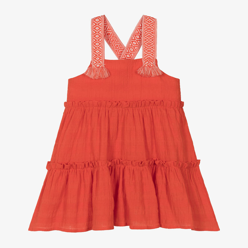 Bright orange sun dress for girls by Mayoral, made in cool, lightweight, tiered cotton muslin with subtle stripes. It has eye-catching, cross-over shoulder straps with fringed trims and an embroidered, geometric pattern in white.