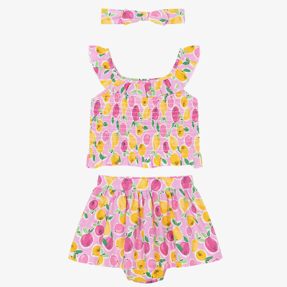 Pink cotton jersey skirt set for little girls by Mayoral, with a summery oranges and pears print. The top has a comfortable ruched bodice and frilly trims, whilst the matching skirt has attached, bright yellow knickers. A headband with a central bow completes the set, with an elasticated panel around the back for a secure fit.