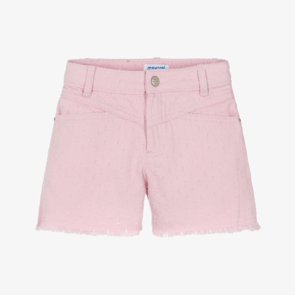 Pink cotton denim shorts for girls by Mayoral, with fun plumetis detailing and frayed trims for a casual look. They have useful front pockets and an adjustable waist for a comfortable fit.
