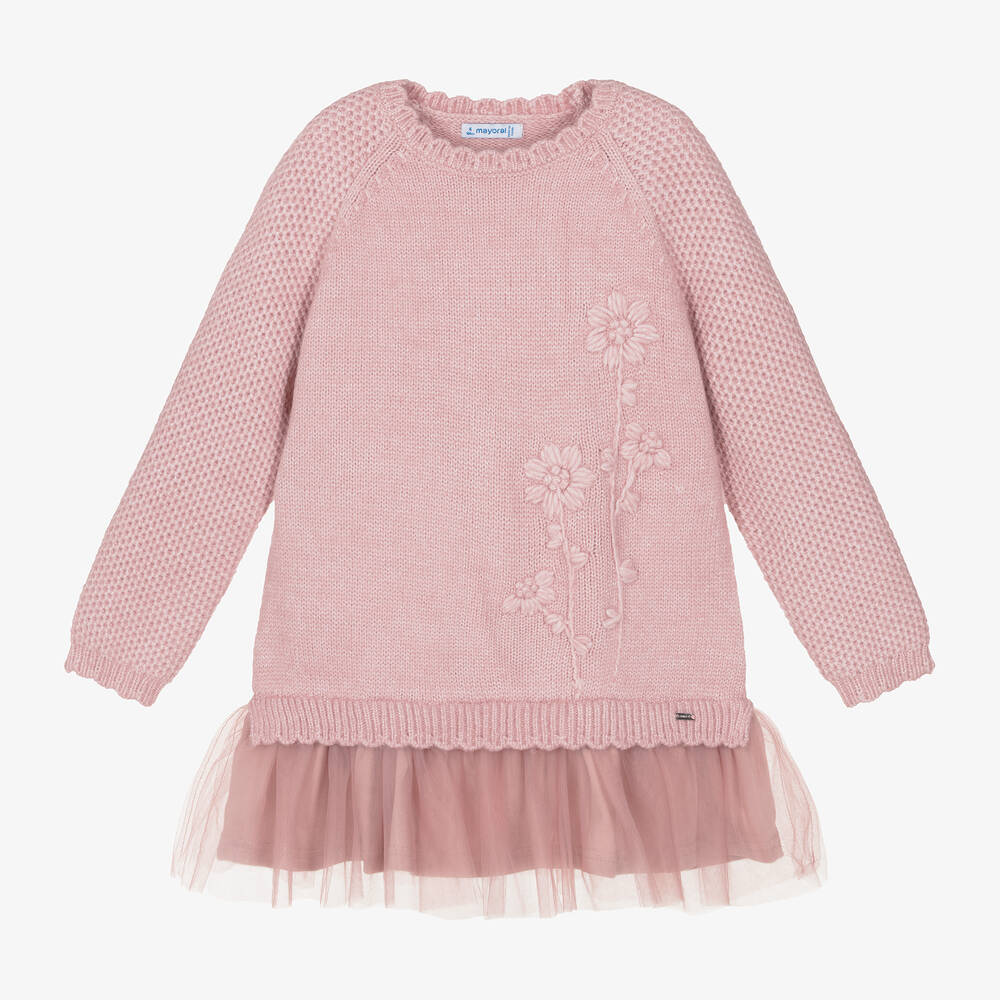 Pink dress for girls by Mayoral, made in a soft knit with added silver threads for a touch of sparkle. The long-sleeves have a honeycomb pattern and there are sweet scalloped, ribbed trims. Made in layers of soft tulle, the dropped hem has a cotton jersey lining and for a pretty finish, there is an embroidered floral design on the front. This item contains recycled fibres.