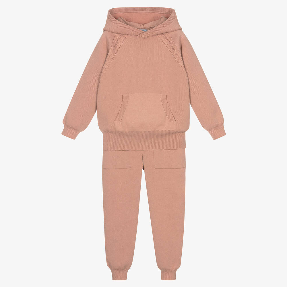 Dusky pink tracksuit for girls by Mayoral, made in a soft, fine knit. The hoodie has cable knit raglan sleeves, a front pouch pocket and a silver logo plate on the ribbed hem. The joggers have front patch pockets and a faux drawstring on the comfortable elasticated waist.