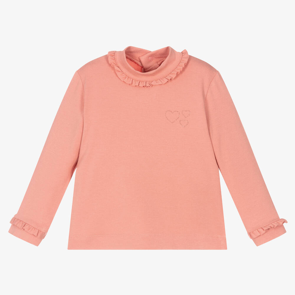 Coral pink turtleneck top for little girls by Mayoral, made in soft viscose jersey. The neck and cuffs have sweet ruffle trims and there is a glittery pink heart print on the chest. It fastens easily with poppers on the back.