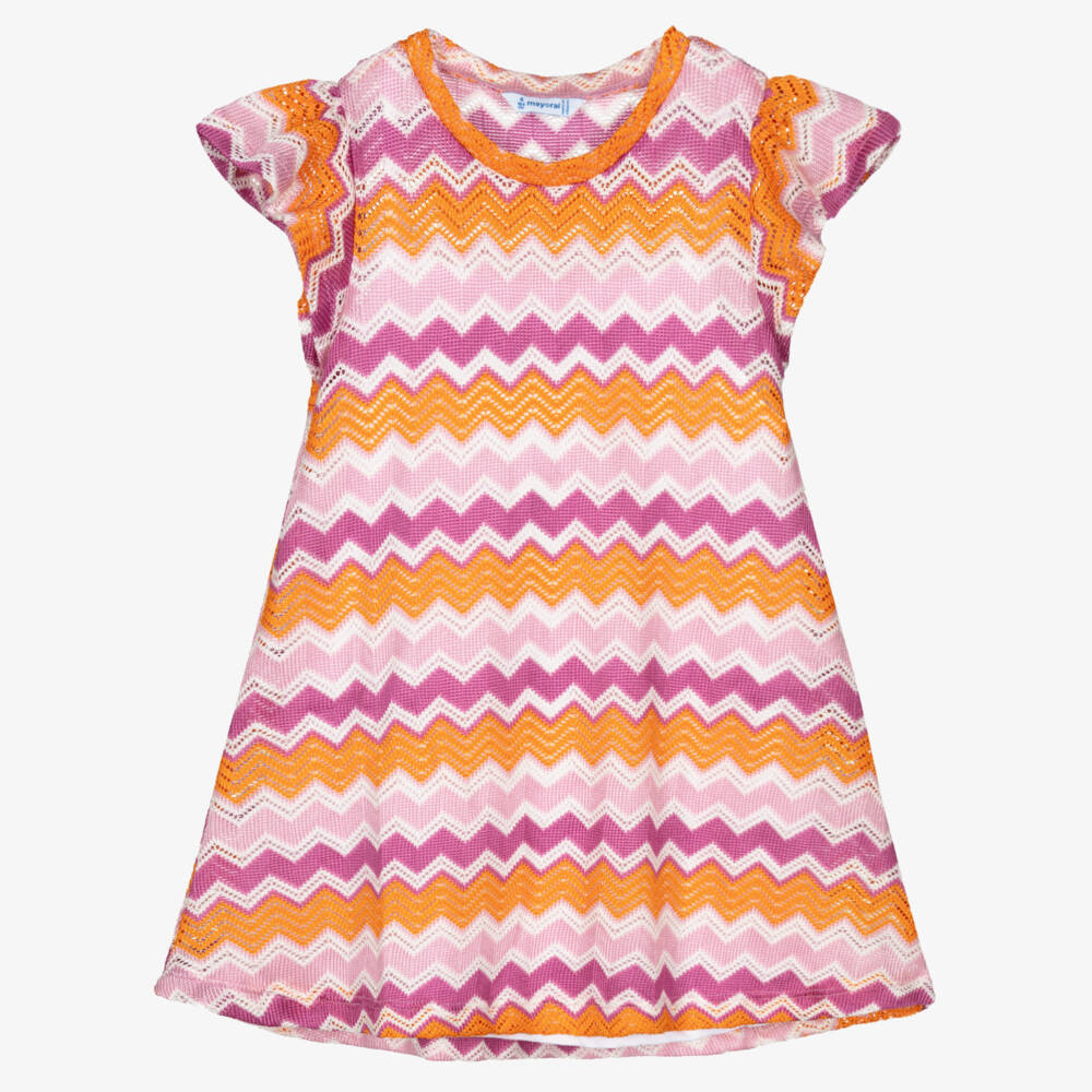 Pretty purple, orange and pink dress for girls by Mayoral, with a fun zigzag pattern. Made in a lightweight, lacy knit, it has a cotton jersey lining for comfort and modesty. It has a gentle A-line shape and short flutter sleeves. Easy wearing, it simply pulls on over the head.