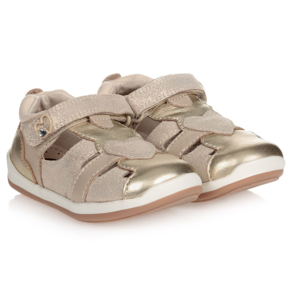Glittery gold and beige sandals for girls by Mayoral. Made in soft leather, they have a heart on the front and velcro-fastening straps that have a beige heart badge sparkling with a diamanté. They have a comfortable, cushioned insole and a non-slip outer sole.
