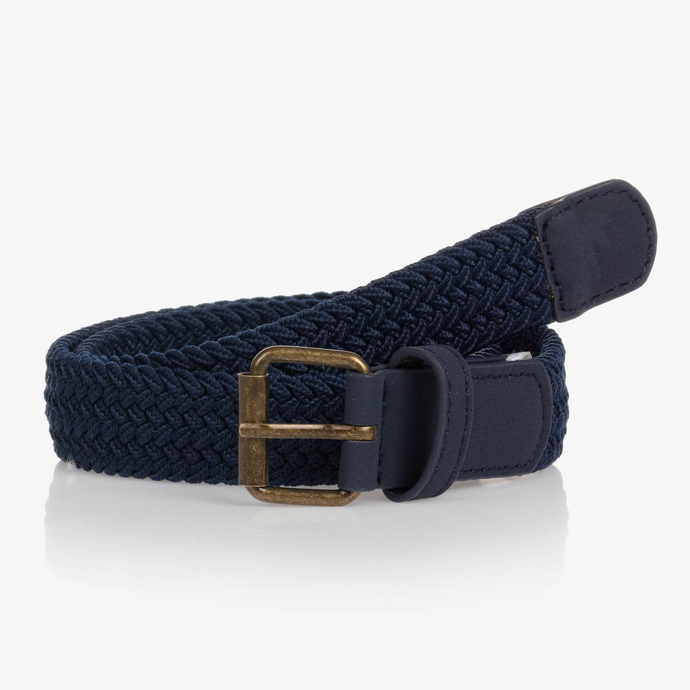 Navy blue woven belt for teen boys from Mayoral. Promising easy comfort and effortless style, this versatile, plaited belt is designed with added stretch and trimmed with faux leather detailing. It fastens with a distressed metal buckle and can be easily adjusted for a good fit.