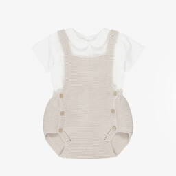 A charming green and white cotton shortie set for baby boys by Mebi. Fastening with wooden buttons, the traditionally styled knitted shortie has cross-over shoulder straps. It comes with a lightweight shirt, with a softly textured stripe design, a sweet Peter Pan collar and mother-of-pearl button fastenings.