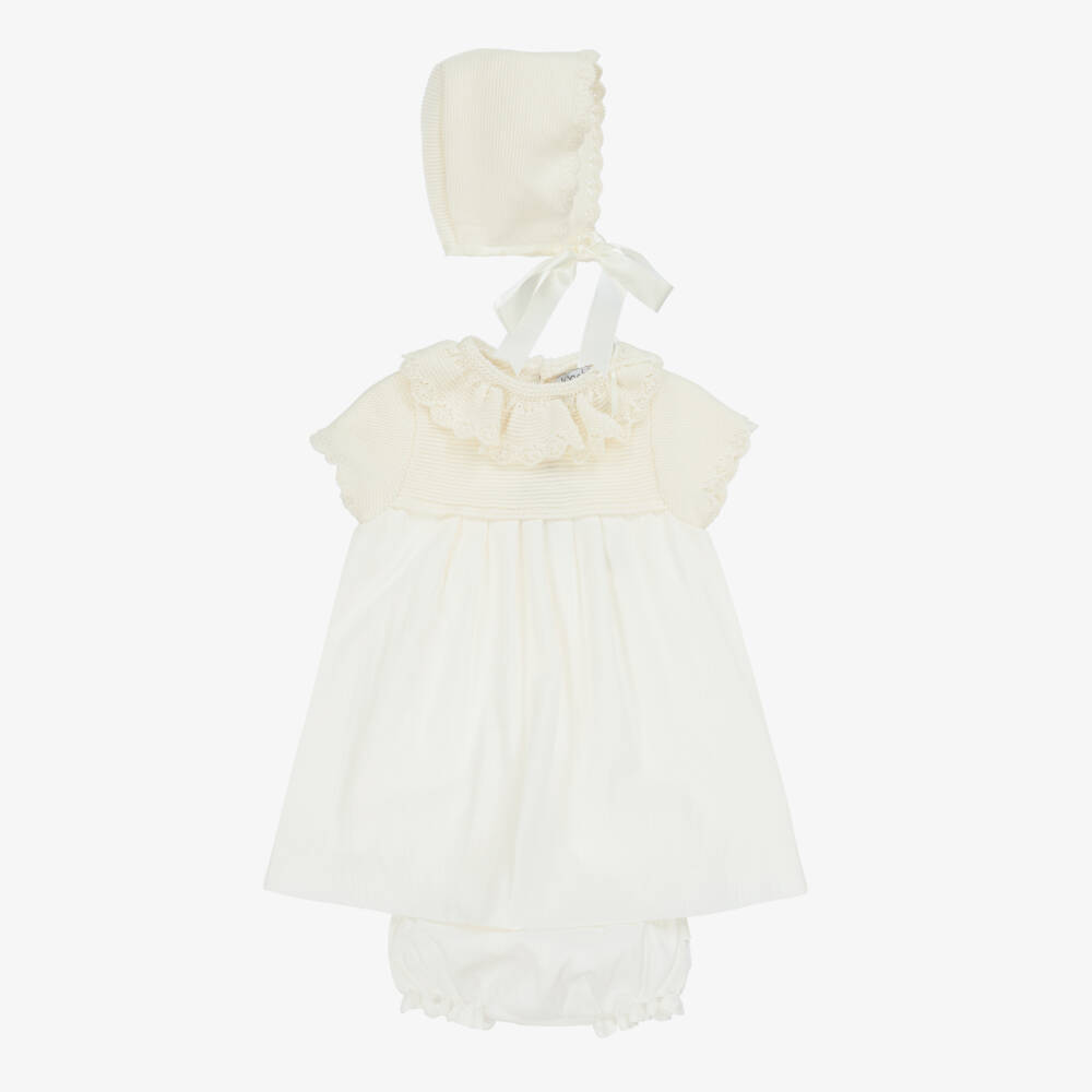 Baby Girls Ivory Cotton Dress & Bonnet Set