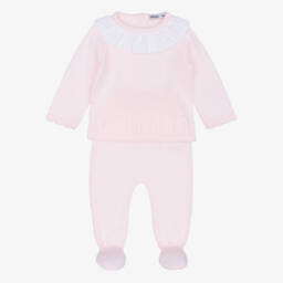 Beige two-piece babygrow for girls by Mebi, made in a soft cotton knit. The long-sleeved top has lovely scalloped trims and a frilly collar with plumeti detailing. It fastens with neat mother-of-pearl buttons on the back. The bottoms have a stretchy, ribbed waistband for a comfortable fit and feel.