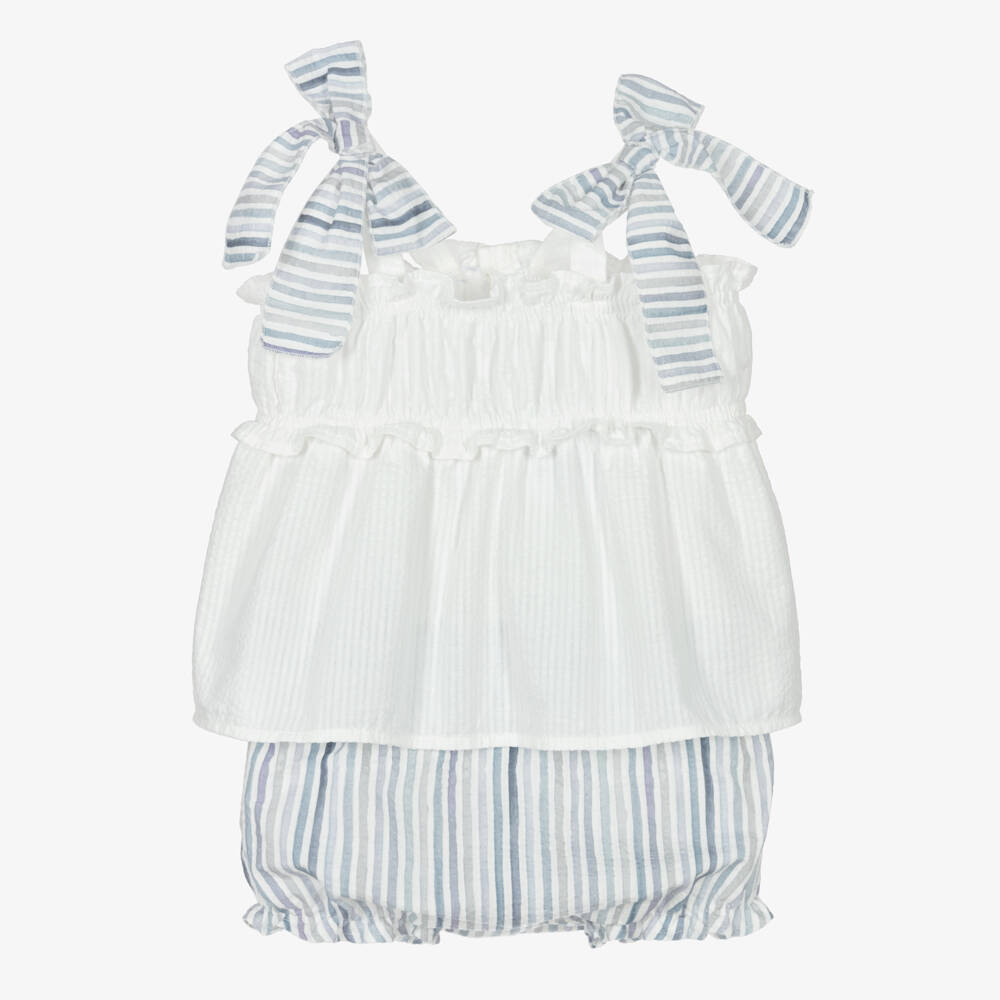 A lovely blue and white shorts set for little girls by Mebi, made in soft and lightweight seersucker. Finely striped, the cotton top has an elasticated bodice with pretty striped bows on the shoulder straps. It fastens with mother-of-pearl buttons on the back. The pull-up shorts are gently elasticated around the waist and legs.