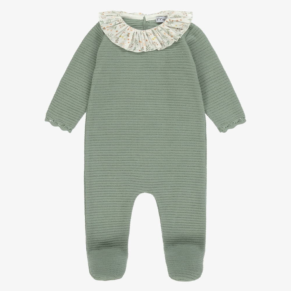 A charming green babygrow for girls by Mebi, finely knitted in soft cotton. This traditional style has a pretty ruffle collar, patterned with a beautiful floral print. It has delicate scalloped trims and fastens on the back with mother-of-pearl buttons.