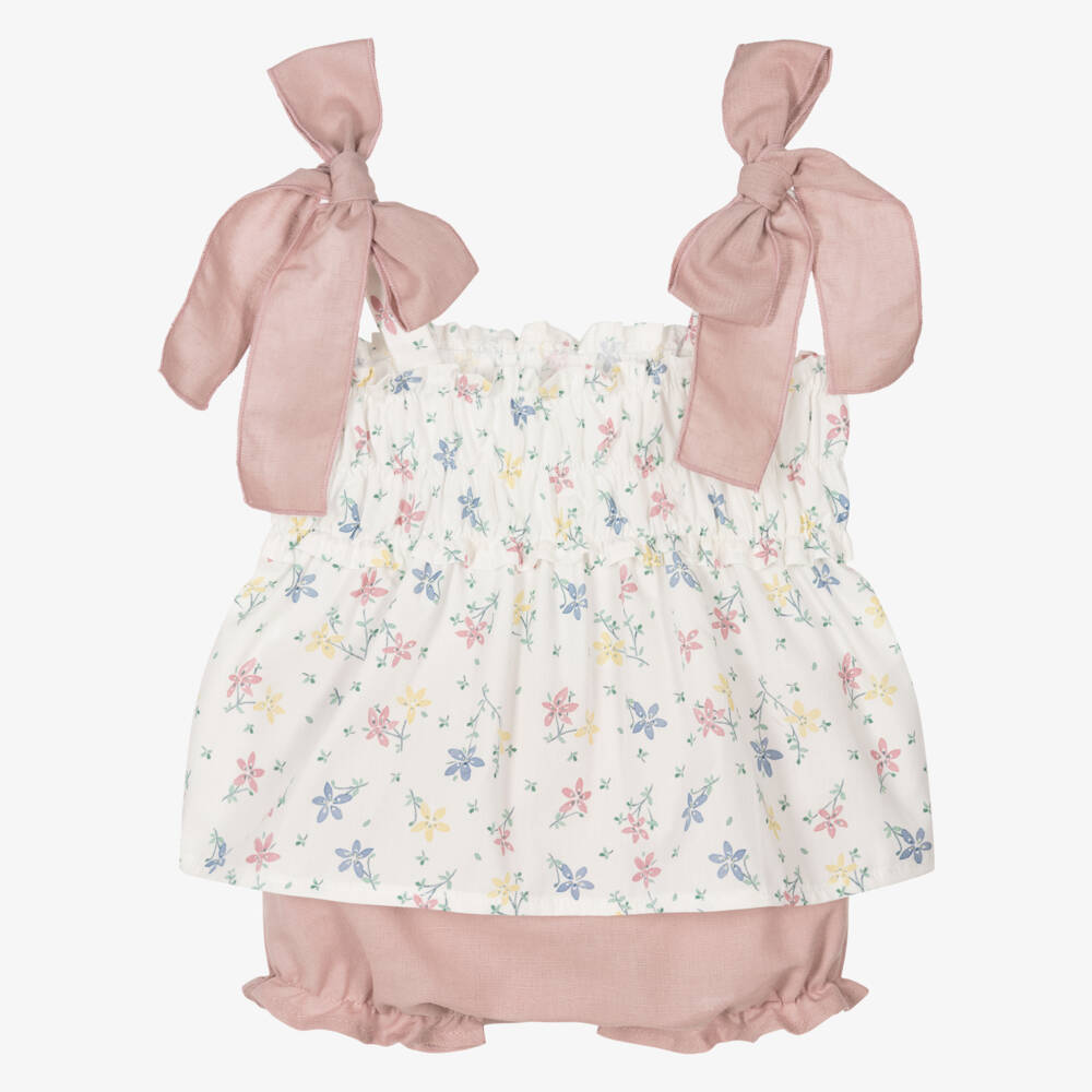 Cute white and pink cotton shorts set for little girls by Mebi. Lovely and lightweight, the pretty top is patterned with a charming floral print in pink, blue and yellow. The bodice is lightly ruched for comfort and the shoulder straps are trimmed with pretty pink bows. A pair of gently elasticated shorts complete the sweet look.