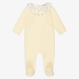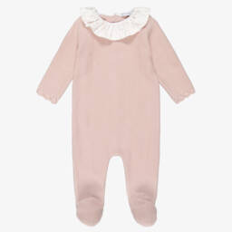 A charming dusky pink babygrow for girls by Mebi, finely knitted in soft cotton. This traditional style has a pretty ruffle collar, patterned with a fine stripe design. It has delicate scalloped trims and fastens on the back with mother-of-pearl buttons.
