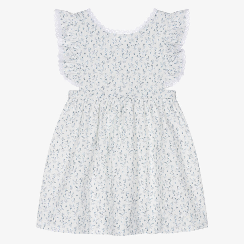 A charming white cotton dress for girls by Mebi. Made in soft, lightweight seersucker and patterned with a delicate blue floral print, this pretty dress has lace trimming and mother-of-pearl buttons for an elegant finish.