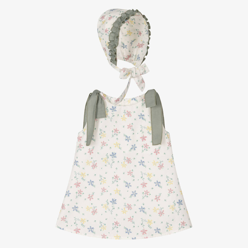 From Spanish brand Mebi, a sweet white cotton dress set for little girls. Patterned with a floral print in muted tones of red, blue and yellow, this lovely A-line dress has green bows on the shoulders. A matching bonnet with green ruffle detailing completes the look.