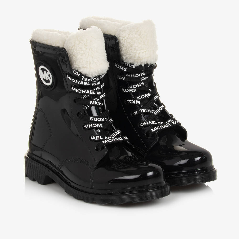 Black boots for girls by Michael Kors Kids, in glossy, flexible rubber. Stylish yet practical, they have logo-printed lace fastenings and a MK motif on the side. They have a removable faux fur and polar fleece lining to keep feet cosy, and a chunky non-slip rubber outer sole for style and grip.