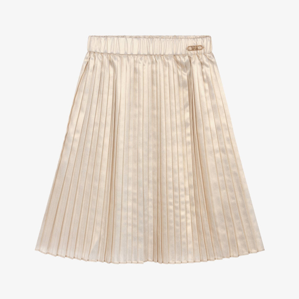 Designed with a subtle gold shimmer, this Mini-me, pleated satin skirt for girls is by Michael Kors Kids. It has a comfortable, elasticated waistband for easy pull-on and is complete with a shiny gold metal logo plate.
