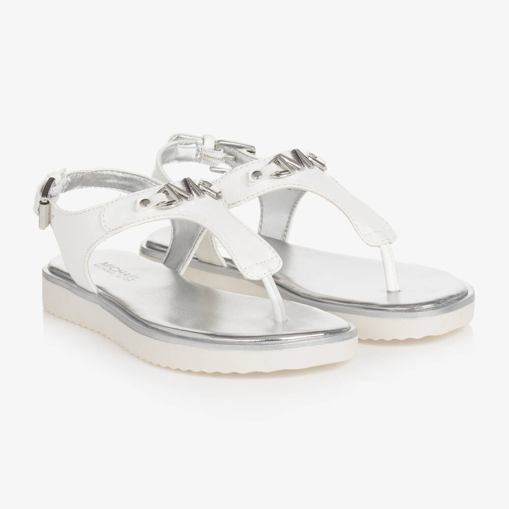 White sandals for girls by Michael Kors Kids, made in soft faux leather. The uppers have a toe post and buckle fastening strap at the back. There is a silver metal horsebit style 'MK' logo on the front for a subtle branded touch. The shiny metallic silver inner soles are lightly padded for comfort and they have non-slip rubber outer soles.
