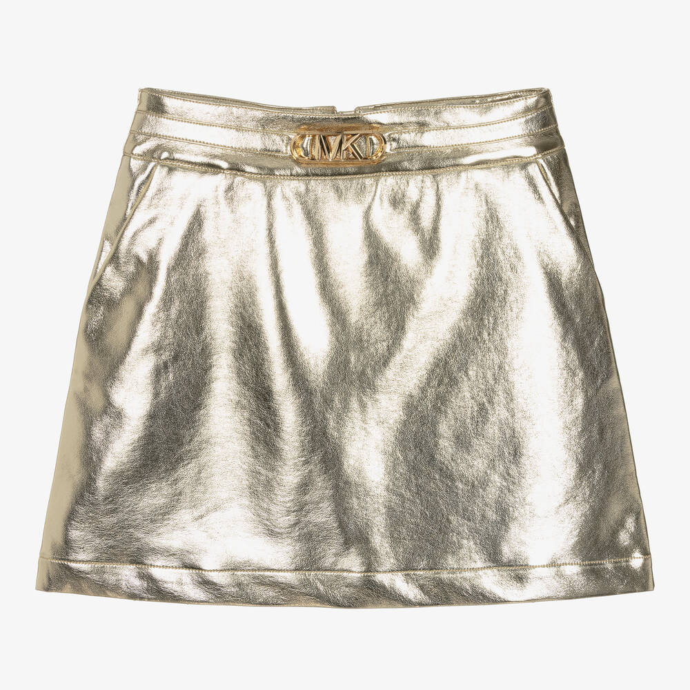 Cool shiny gold mini skirt for teen girls by American label Michael Kors Kids, just right for making an entrance in. Made in soft faux leather, it has a gold logo on the waistband for instant designer appeal and useful, slanted front pockets. It fastens with an exposed ivory and gold zip around the back, which has a logo pull tab for extra brand detailing. There is a soft viscose lining for comfort.
