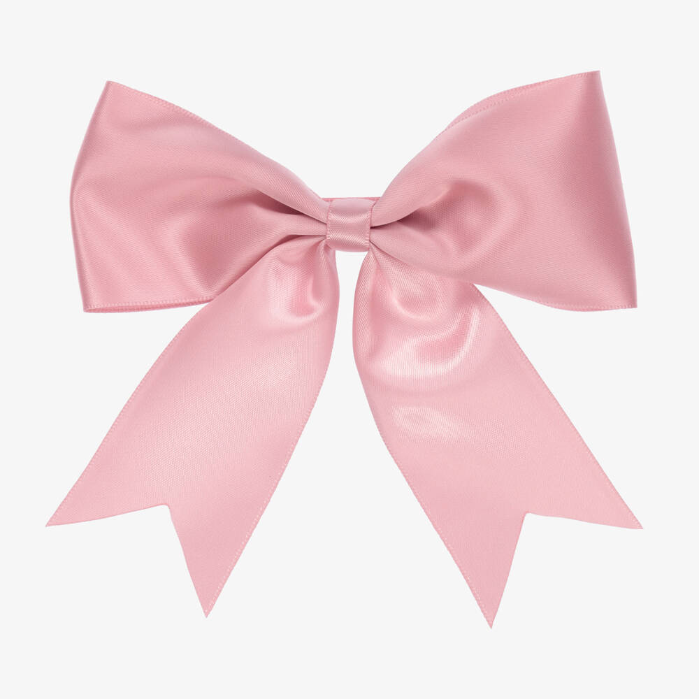 Girls pink hair clip by Milledeux, with a beautiful satin bow set on a nickel-free metal clip. The hairstylist-grade alligator clip has no teeth but is strong enough to stay put in thin or short hair.