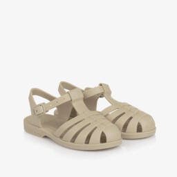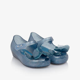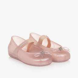 Red jelly shoes for girls by Mini Melissa, made in sweet-scented, soft and durable Melflex® PVC. These stylish peep-toe shoes have a hidden wedge heel, softly padded insoles and non-slip pads on the soles. They have a large bow on the front, with a glittery pink bow and pink metallic centre. The velcro fastening strap is trimmed with silver stud detailing.