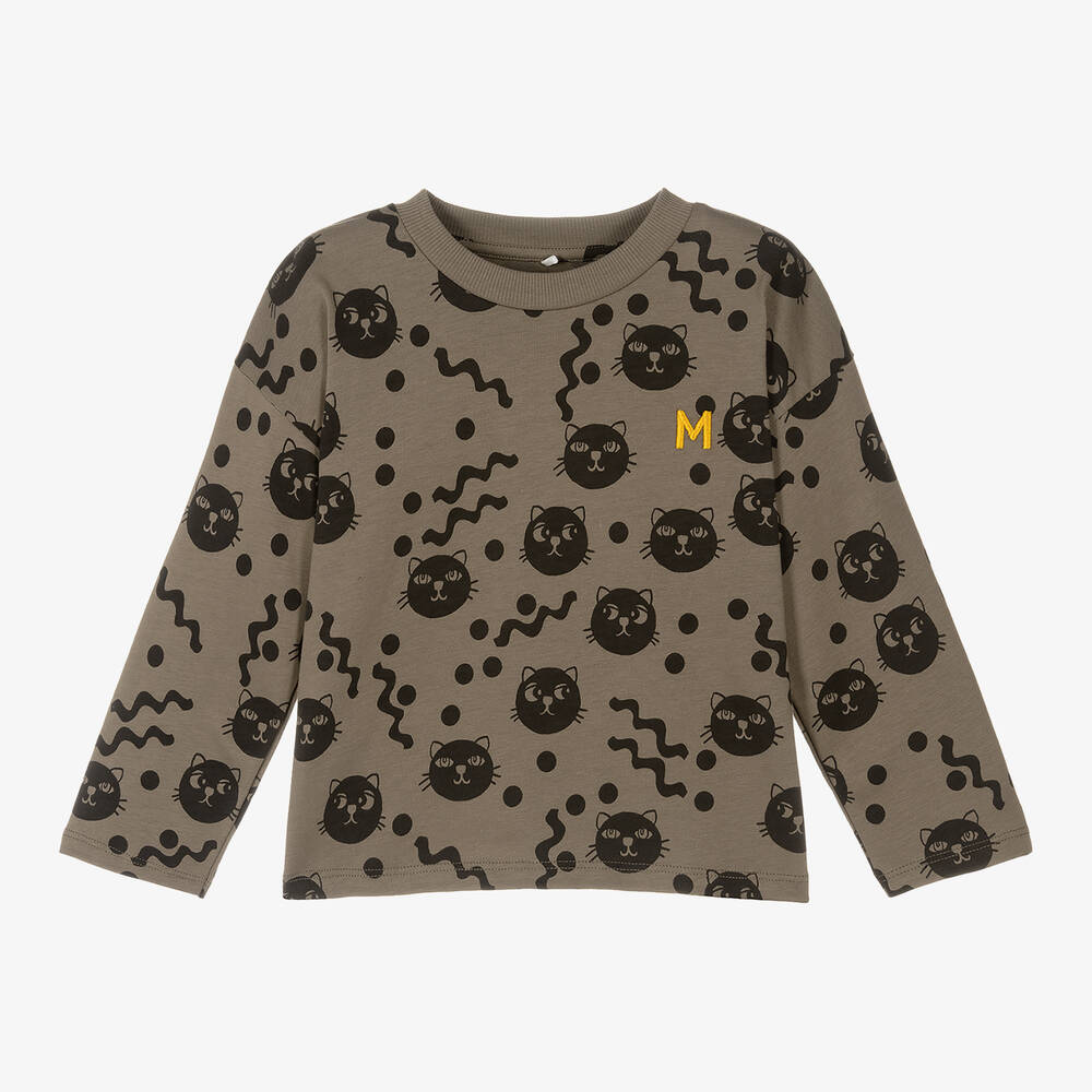 Fun brown long-sleeved T-shirt for boys and girls by Mini Rodini, patterned with cute cats and squiggly motifs in black. Super soft and comfortable, it is made in organic cotton jersey with dropped shoulders and a yellow embroidered logo on the chest.
