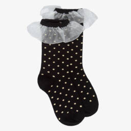 A pair of orange-red knee-high socks for boys and girls by Mini Rodini. They are made in an organic cotton rich blend with an ivory stripe and a red cat motif on both sides.