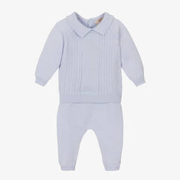 Blue trousers set for baby boys and girls by Minutus, knitted in soft and lightweight cotton. The cardigan has a lovely cable-knit pattern and classic mother-of-pearl button fastenings. The matching trousers have a fold-over, ribbed waistband.