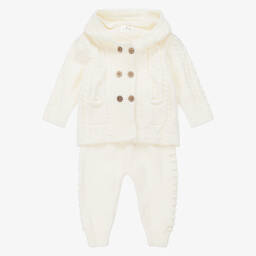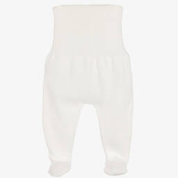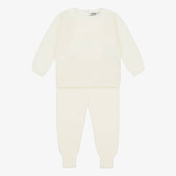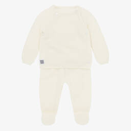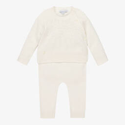 Sweet ivory trousers set for baby boys and girls by Minutus, knitted in the softest cotton. The wrap-over cardigan has a pretty moss stitch pattern, fastening neatly with ties on the sides. The lightweight trousers have a wide ribbed waistband and cosy ribbed cuffs. Both pieces have the designer's grey logo badge on the front.